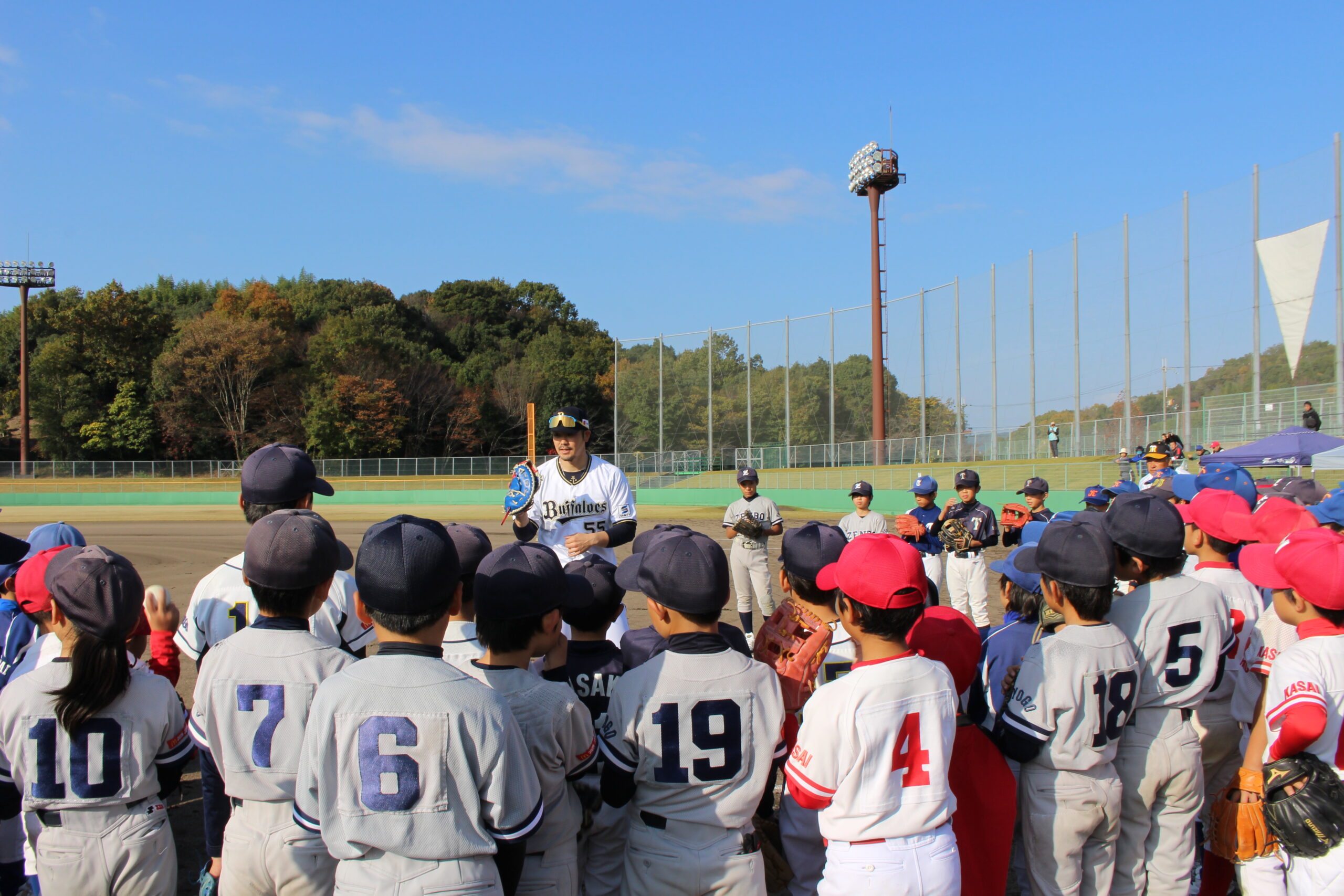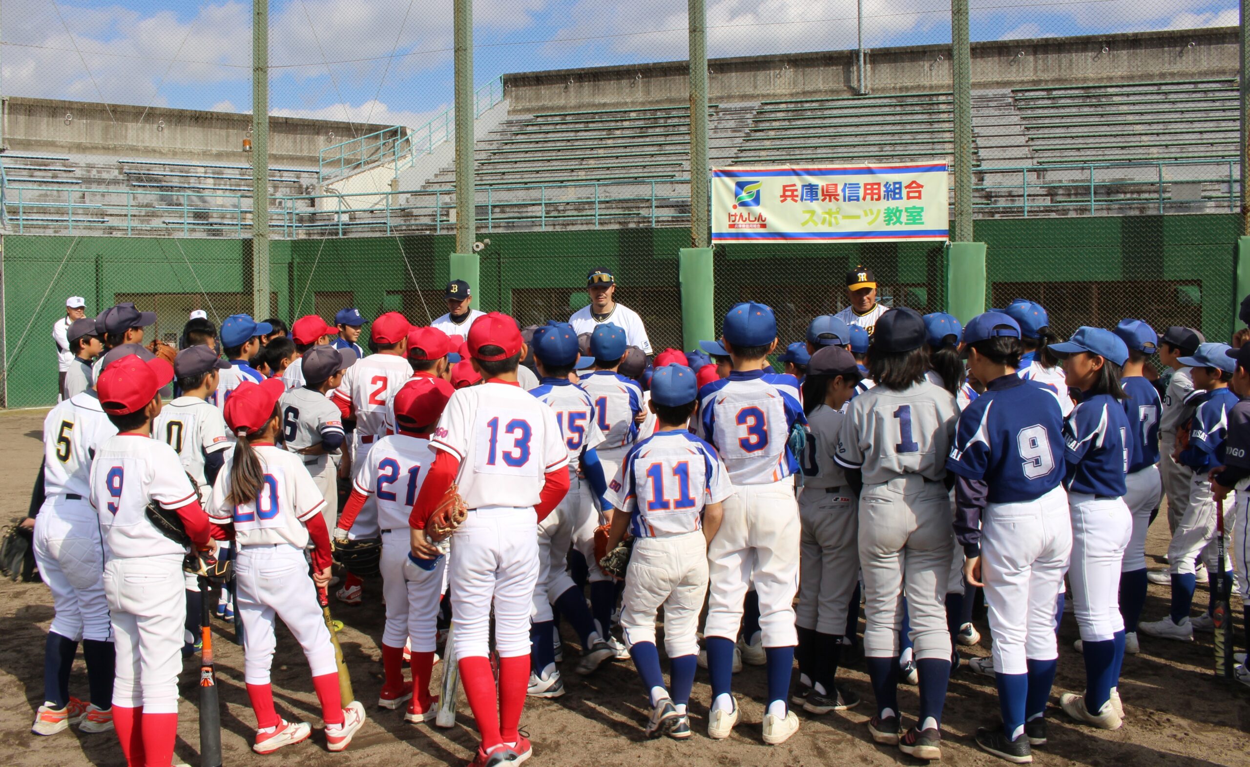 オリックス・バファローズで活躍された藤井康雄氏、Tー岡田氏、海田智行氏にコーチを務めていただき、加西市の野球チームに所属する子どもたち約100人に身体の使い方やバッティング・ピッチングの指導をしていただきました。また、野球教室後は、サイン会・写真撮影会も行いました。
