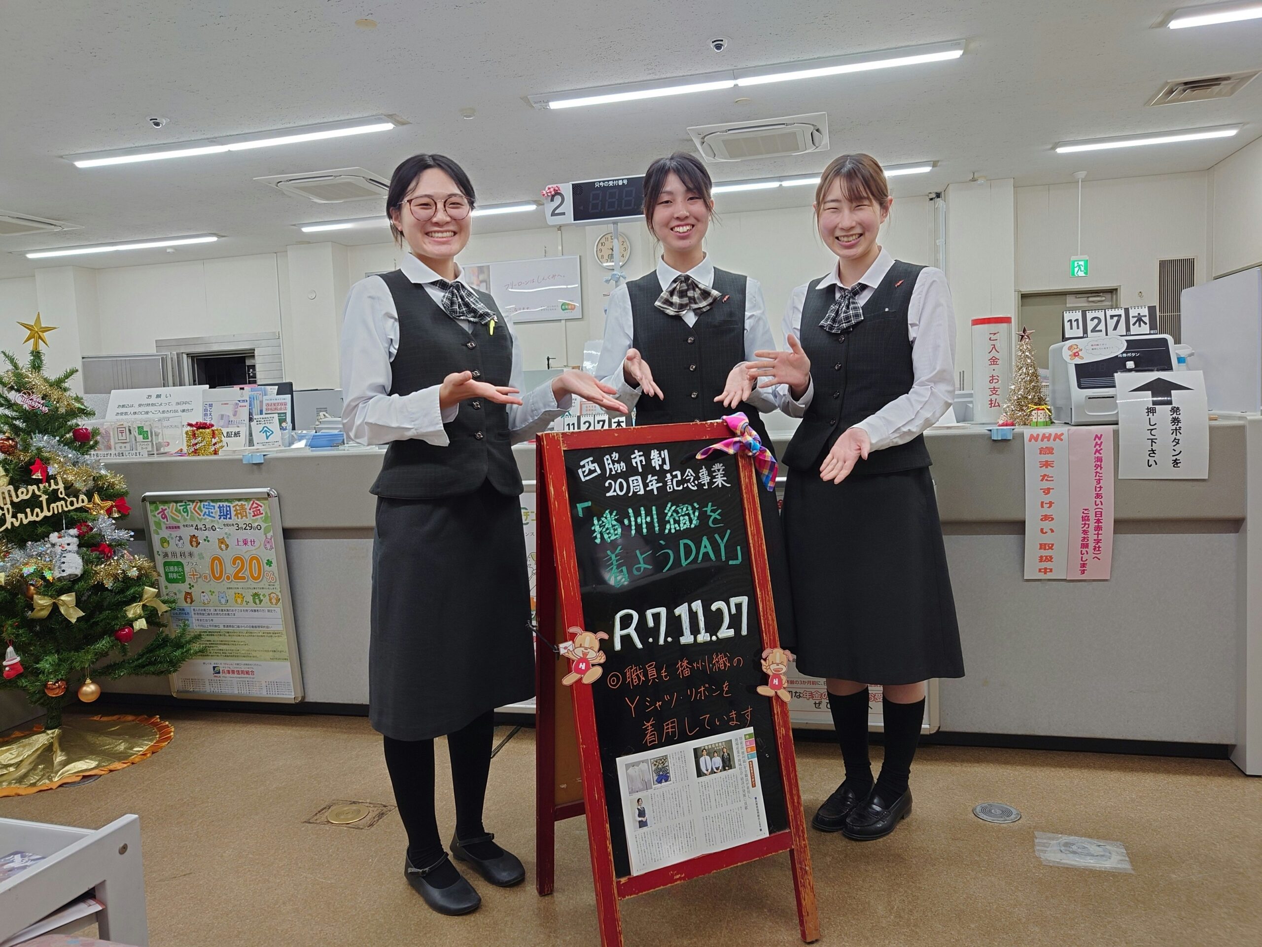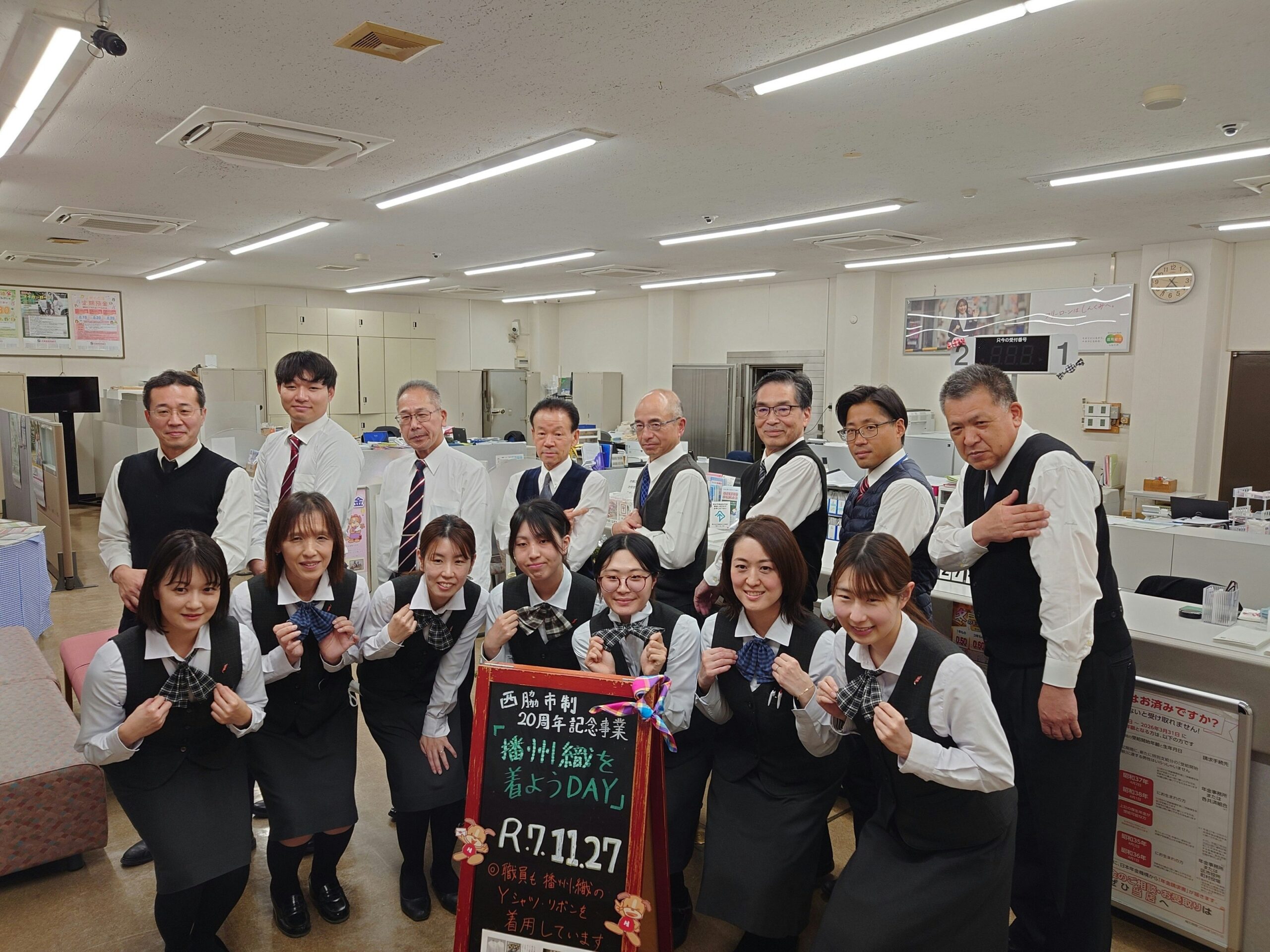 令和7年11月27日(木)、西脇市制20周年記念事業として、西脇市役所職員の皆さま(医療職を除く)が一斉に播州織を着用する「播州織を着ようDAY」が実施されたことに合わせ、当組合の西脇支店職員全員が播州織商品(ワイシャツ・ブラウス・制服用リボンタイ)を着用して勤務しました。