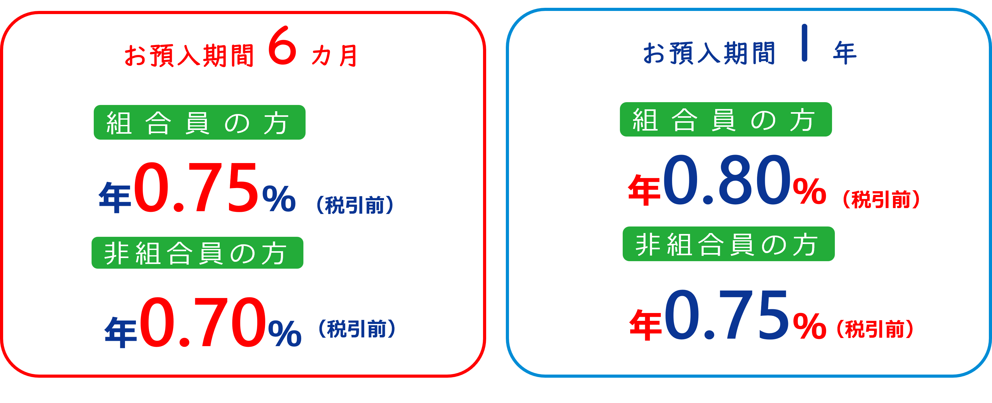 ※上記金利は、初回お預入れ時のみ適用します。自動継続後は、自動継続時の当初お預入期間に応じた店頭表示金利(お預入れ金額1,000万円未満はスーパー定期預金、お預入れ金額1,000万円以上は大口定期預金)を適用します。 |